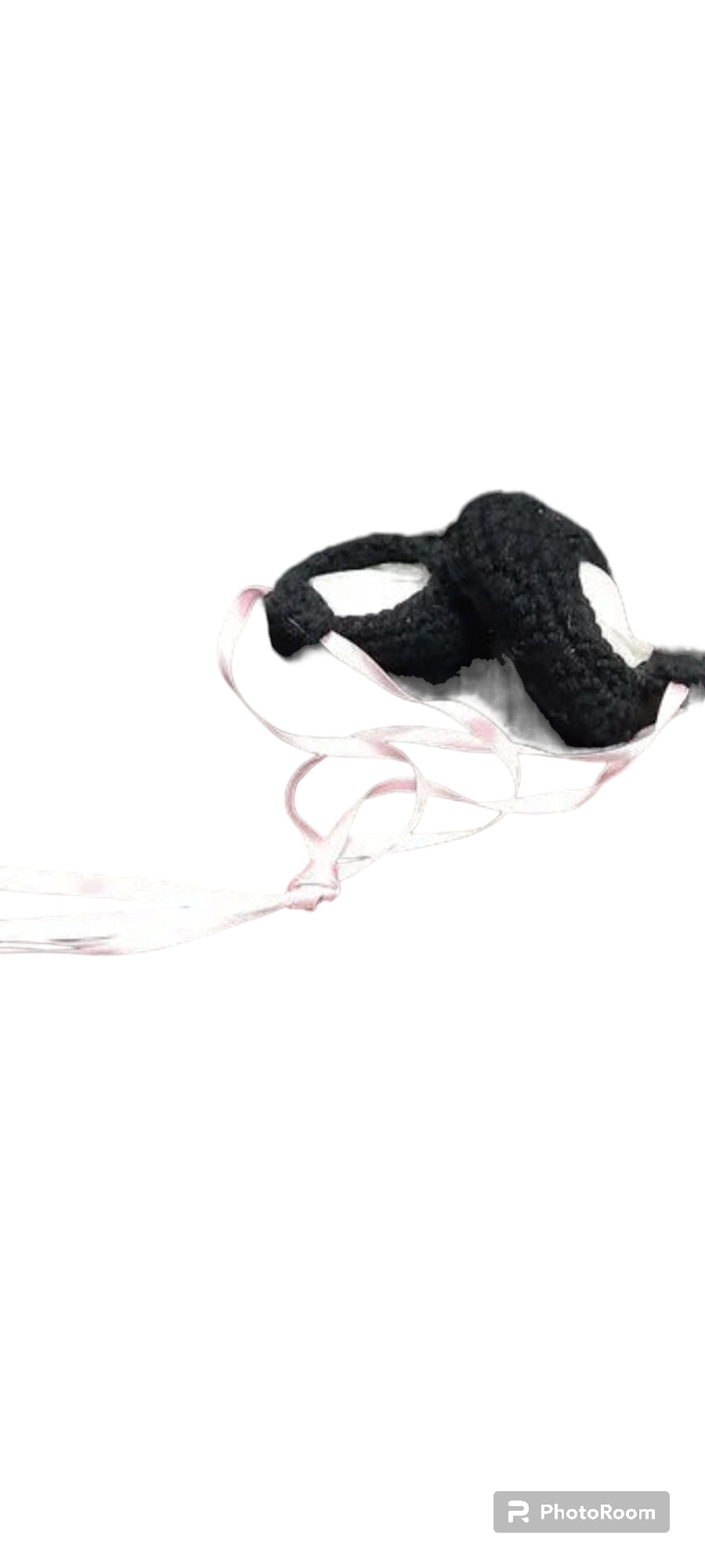 These handmade ballet booties are stitched in midnight black and tied with a soft pink ribbon—like tiny slippers for your little prima donna or dapper danseur. Crocheted with love and sized for newborns, they’re snuggly, stylish, and ready to steal the spotlight in every crib-side performance.