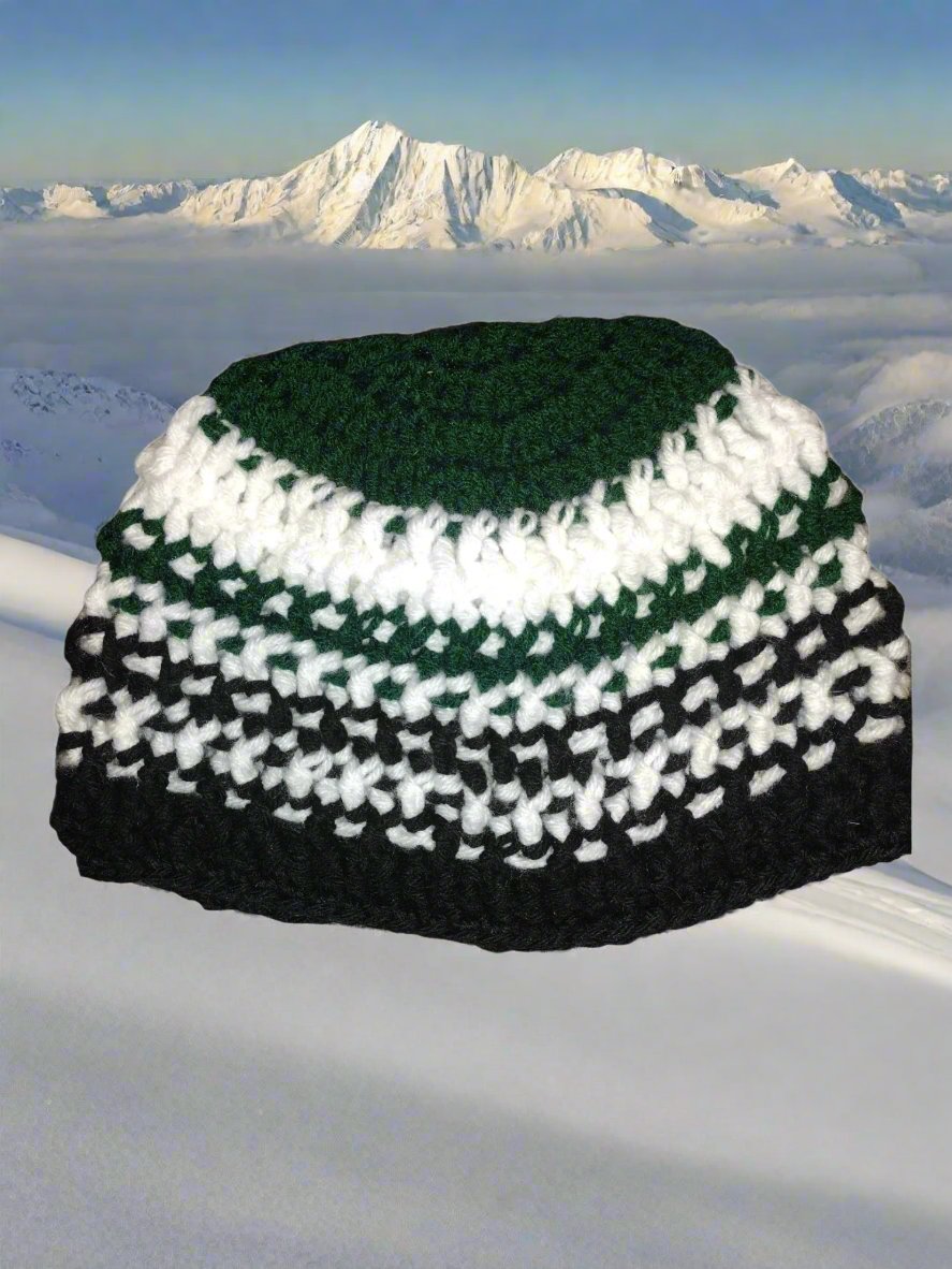 Chill in style with the Frostbyte Beanie—your go-to winter wingman stitched for snug vibes and street cred. Crocheted by hand with soft acrylic yarn, this unisex hat blends deep forest green, crisp white, and bold black stripes for a look that’s equal parts retro and rad.