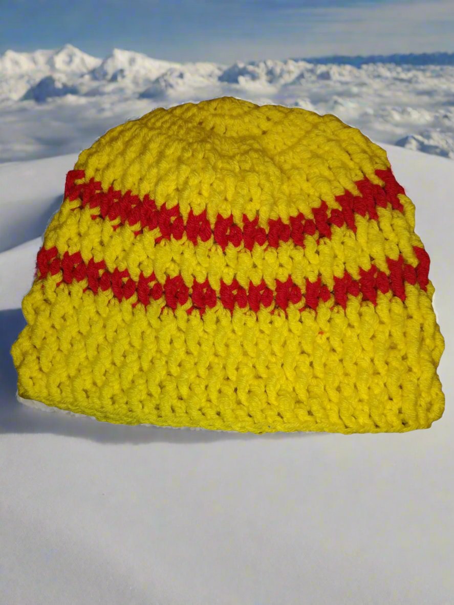 Say hello to the Hothead Beanie—a handmade crochet crown for the color-confident. With blazing red stripes wrapped around a sunshine yellow base, this unisex winter warmer is here to light up grey days and chilly nights.