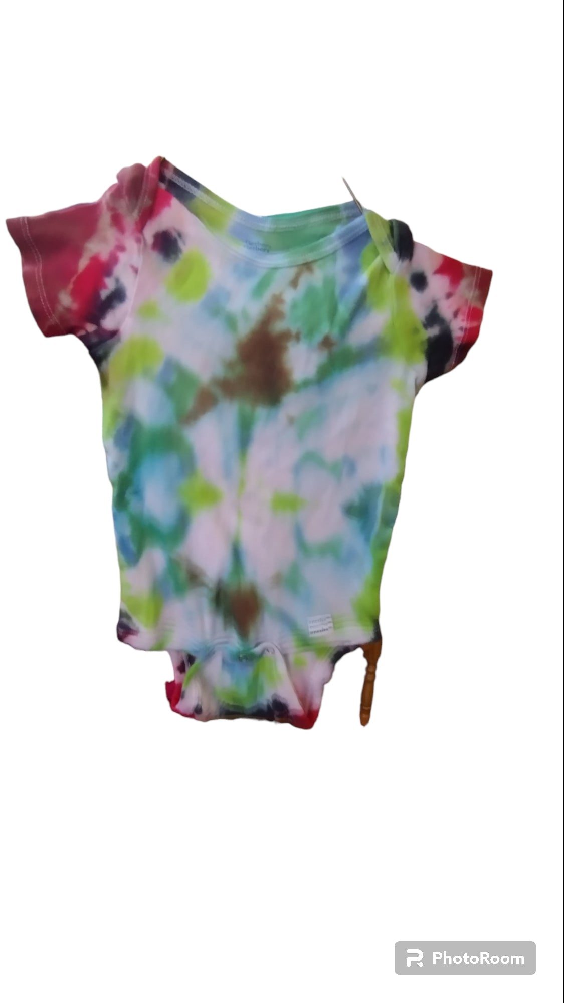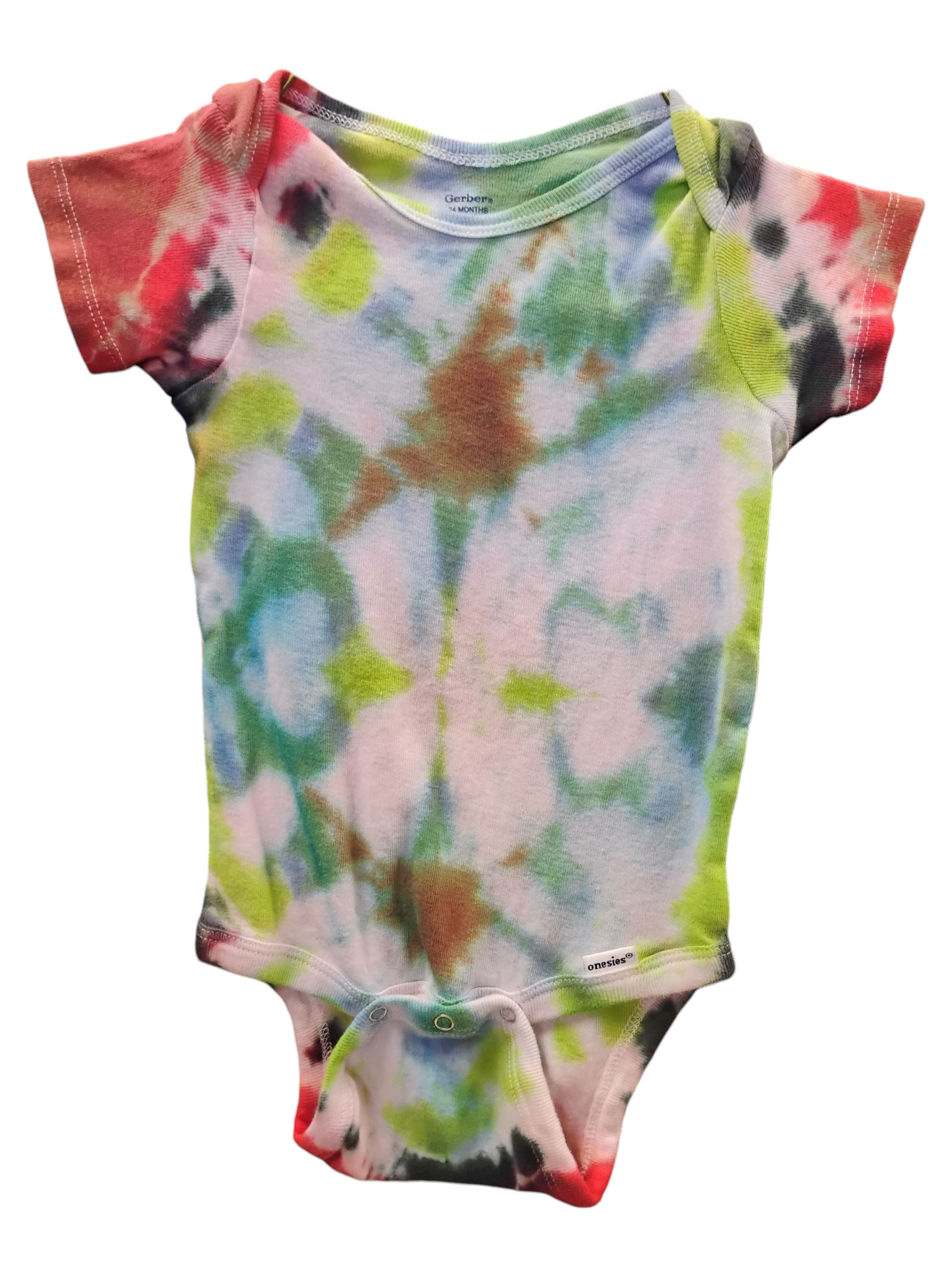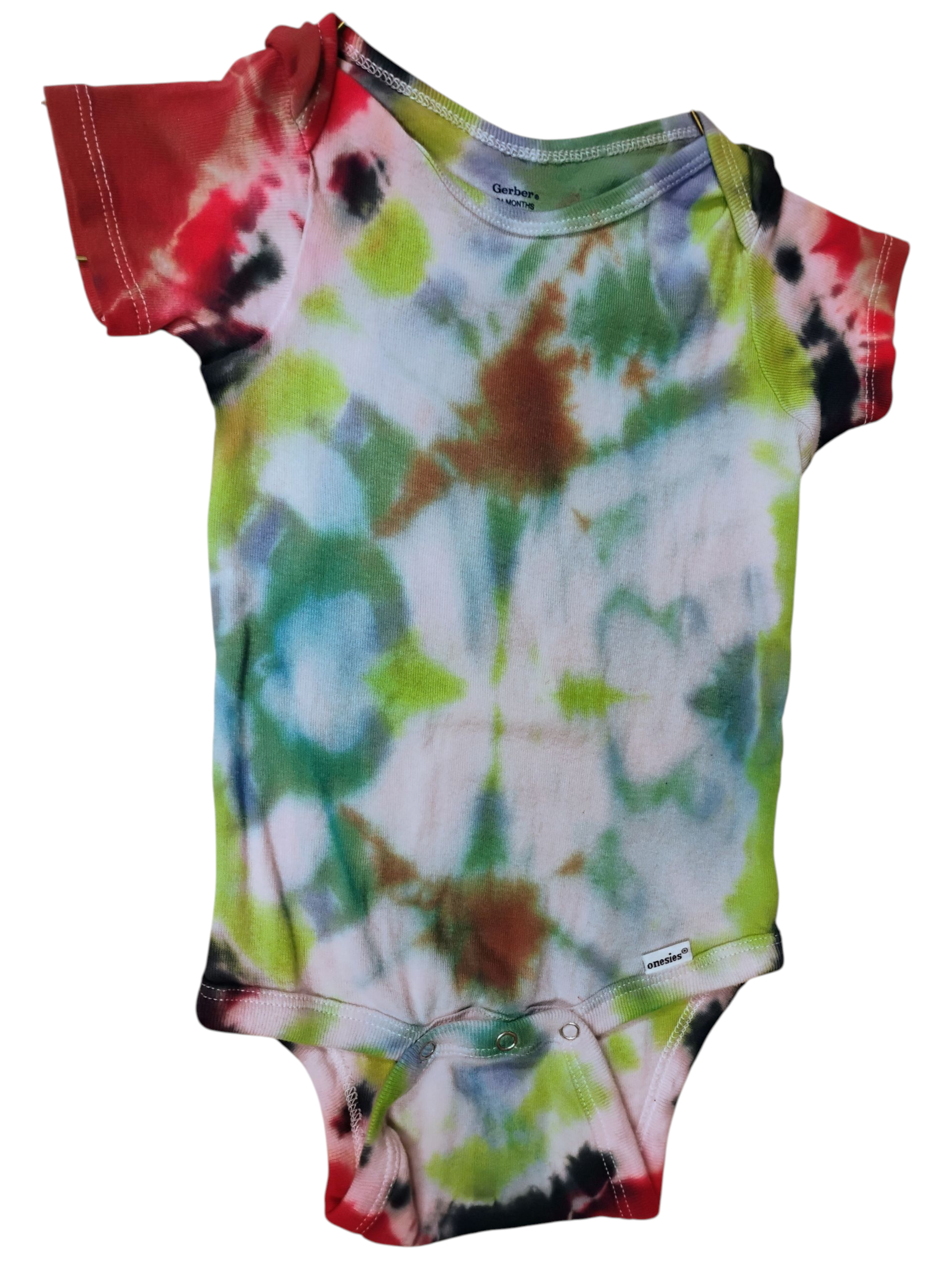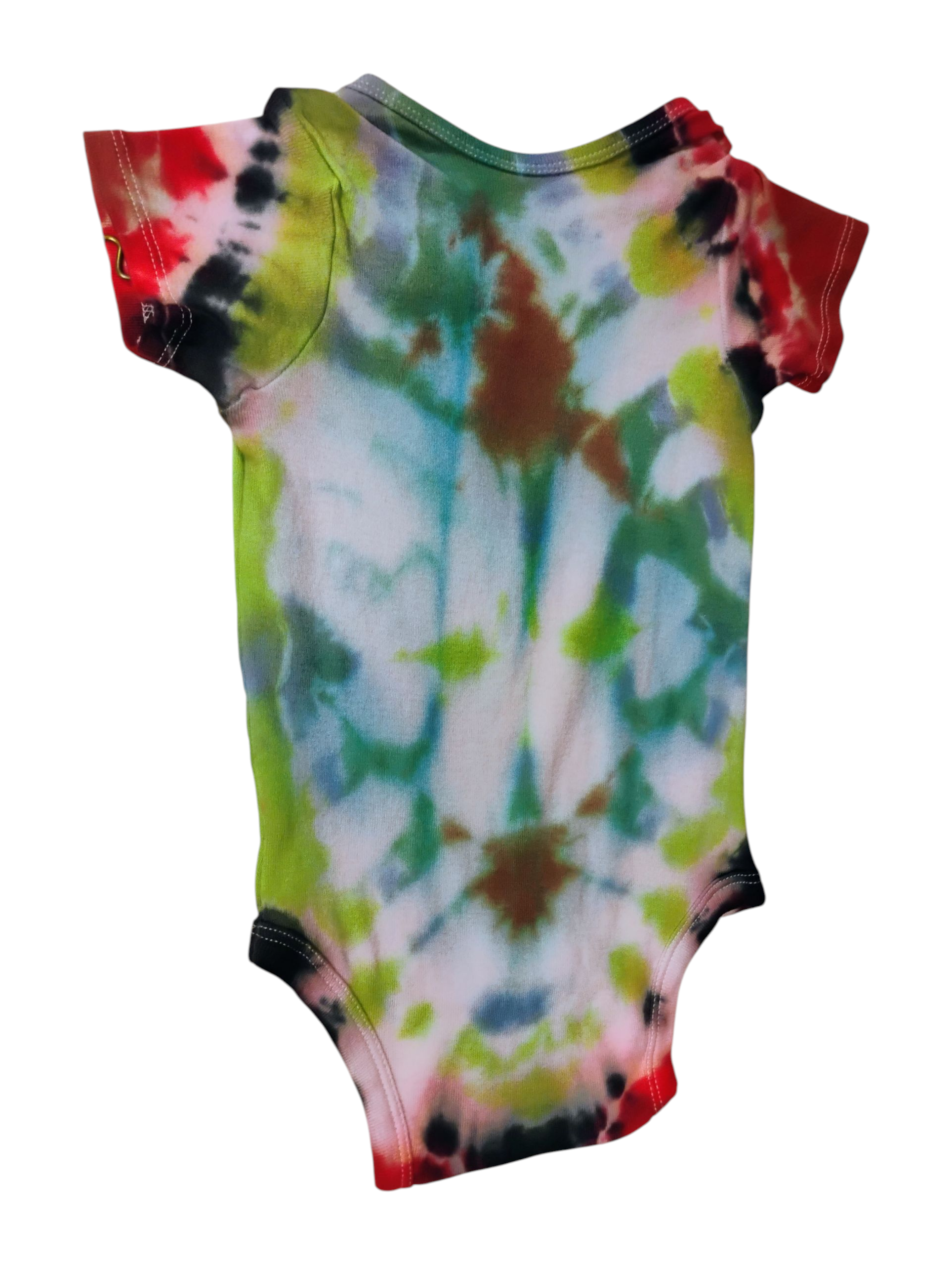 Your little lightbeam just found their signature look. This hand-dyed onesie is a kaleidoscope of joy—earthy reds, mossy greens, sky blues, and a splash of stardust brown, all swirling in perfect baby-sized chaos.