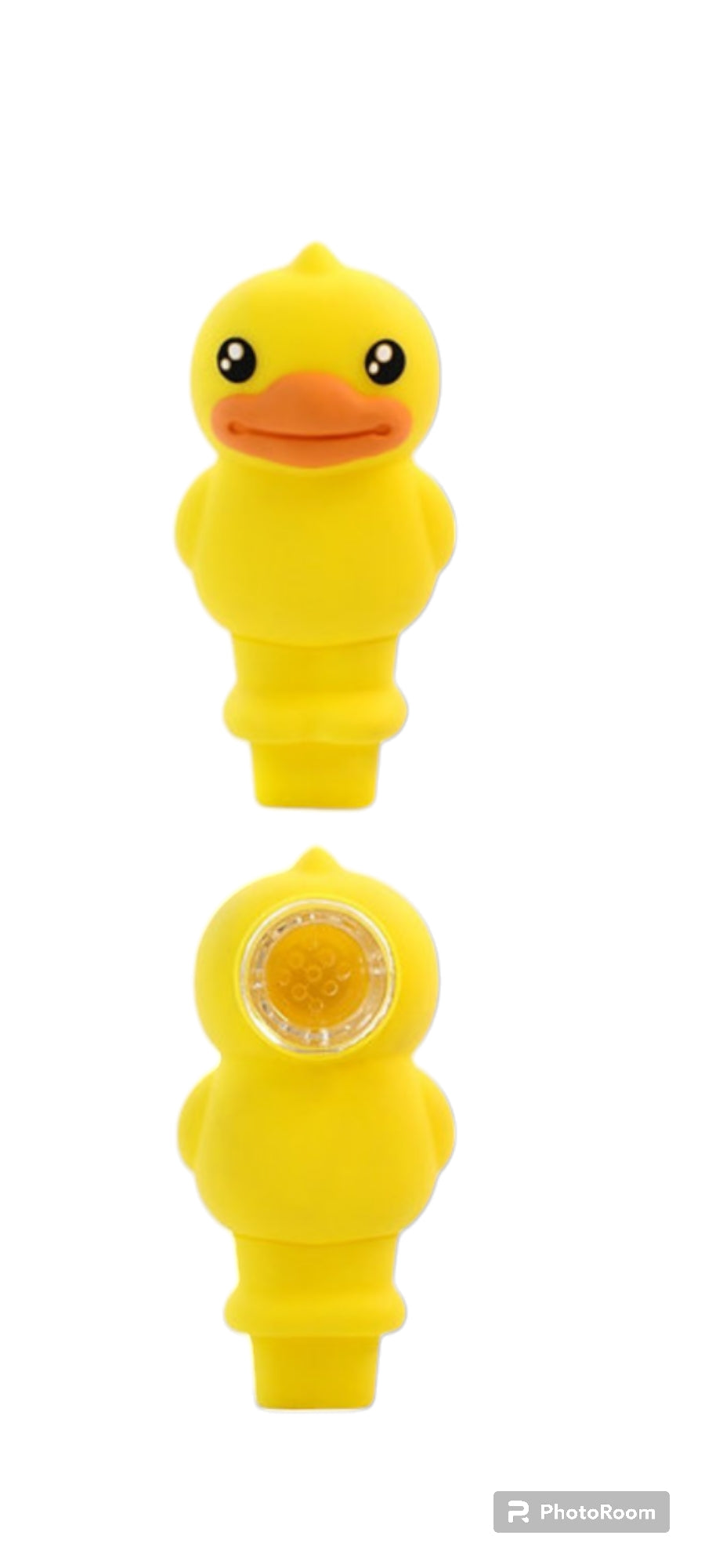 Adorable silicone duck hand pipe with glass herb bowl. Measures approximately 3.25"