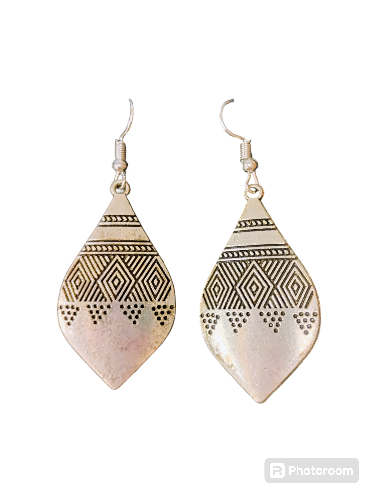 ✨ Let your style wander with Desert Bloom—a soulful pairing that blends boho geometry with sun-kissed serenity. The first pair features etched teardrop dangles in silver-toned metal, patterned with tribal-inspired prints that echo ancient paths and desert winds. The second pair brings balance with silver post studs crowned in turquoise—a radiant sun-floral design that feels both grounded and celestial.