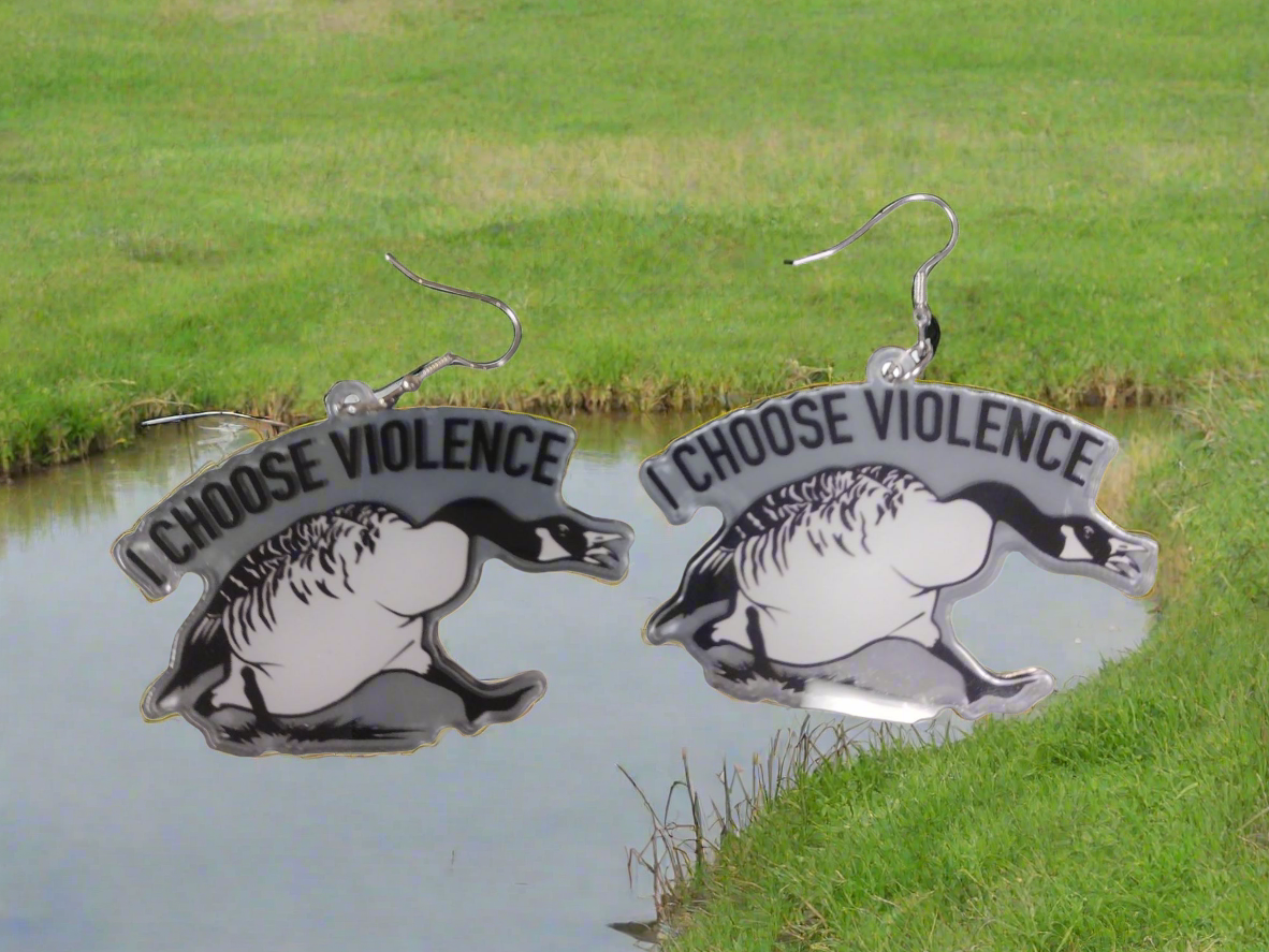 These geese arenât here to make friendsâtheyâre here to make statements. The Honk If You're Hostile dangle earrings feature a battle-ready goose mid-charge, wings flared, beak open, and the iconic war cry CHOOSE VIOLENCE flying proudly overhead. Itâs barnyard rebellion meets fashion-forward ferocity.