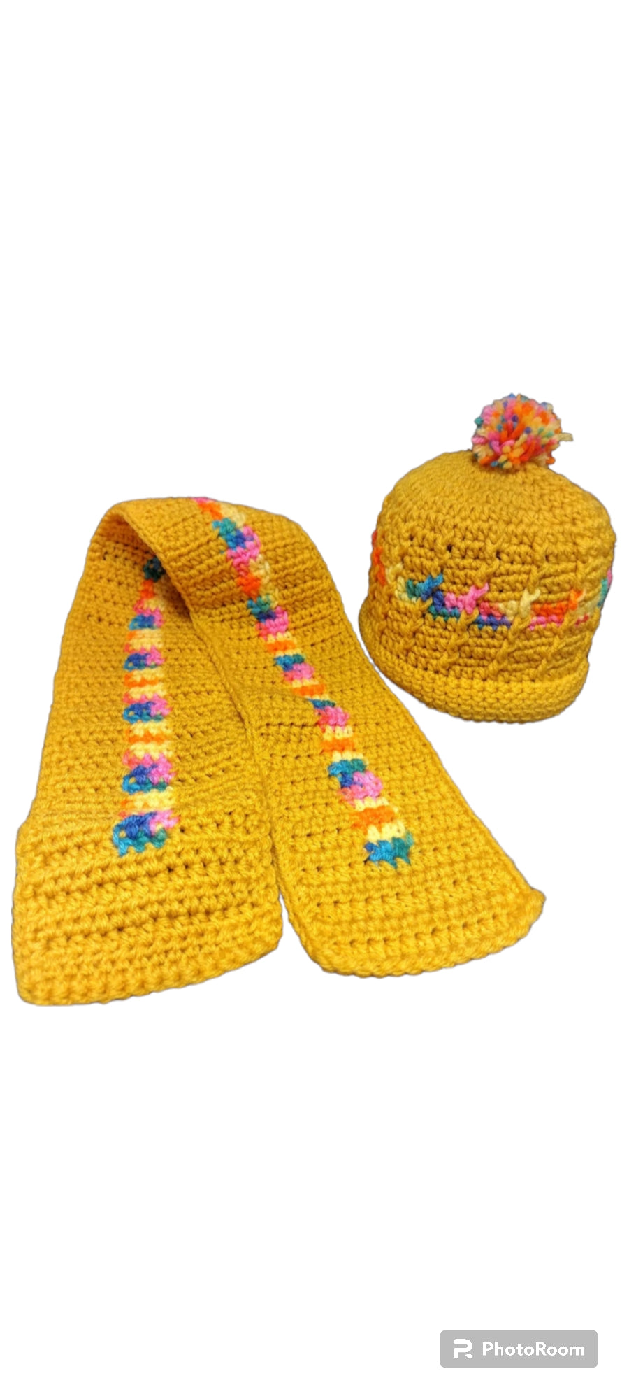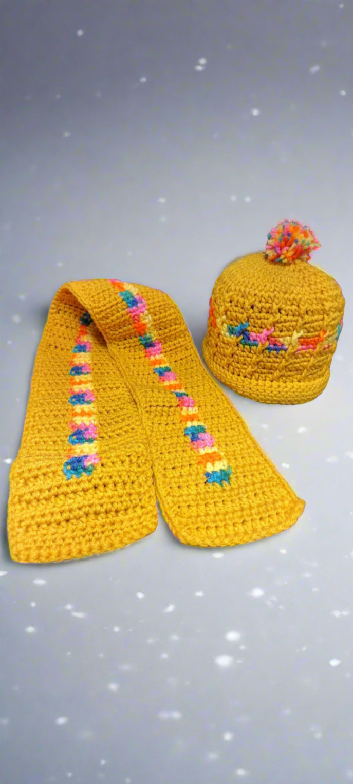 Wrap your little one in warmth and style with this adorable handmade crocheted kids hat and scarf set in a dazzling gold hue! Featuring a playful pom pom on the hat, this cozy duo is perfect for chilly days, ensuring your child stays snug while looking oh-so-cute.