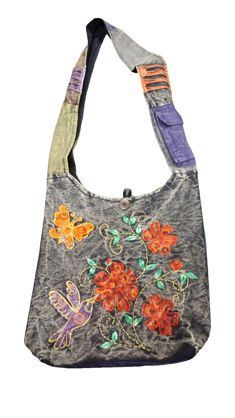 Hand-appliqued with a radiant hummingbird, fluttery butterfly, and wildflower vibes, this bag feels like a soft breeze on a sunlit trail. The colors pop like a blooming garden, and the energy? Pure harmony.