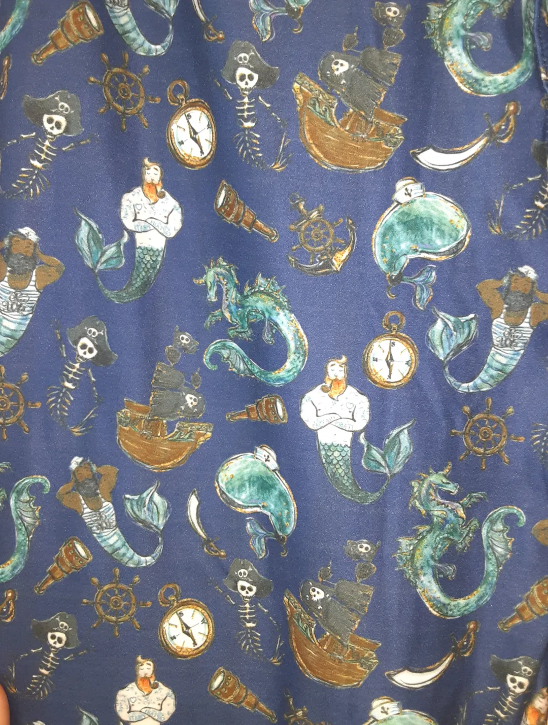 Make waves in Mermayhem™—the leggings that bring high-seas chaos and mythical swagger straight to your legs. With flexin’ mermen, pirate skeletons, sea monsters, and nautical oddities swirling across a deep ocean-blue backdrop, these stretchy stunners are pure fantasy-meets-fierce.