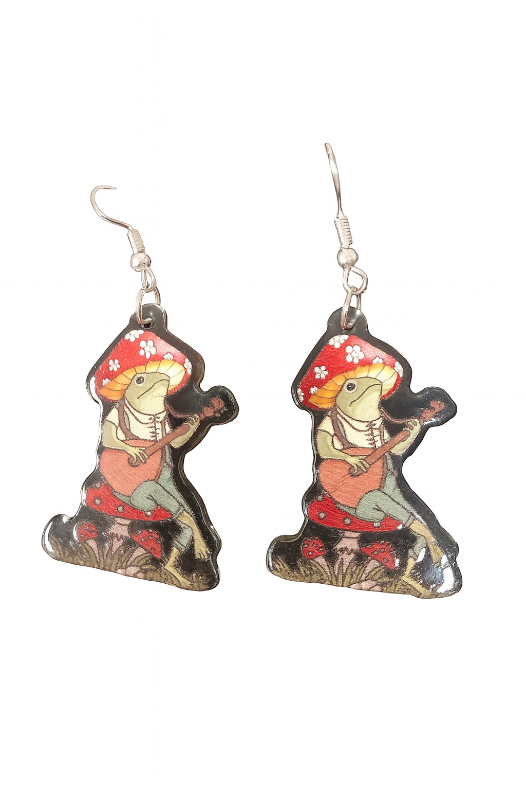 Pluck a little magic from the meadow and let your lobes sing with joy! These enchanted dangle earrings feature Sir Croaksalot, the forest’s most beloved banjo-strumming bard, perched atop his crimson-capped toadstool stage. With a mushroom crown and a melody in his heart, he’s here to serenade your style into the realm of whimsy.