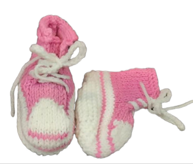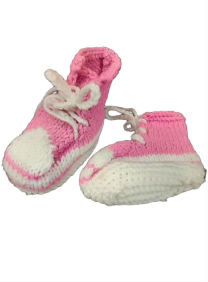 These handmade booties are serving up classic high-top attitude with a cozy crochet twist. Styled in bold pink and crisp white, they channel vintage Chuck Taylor vibes with soft acrylic yarn that’s gentle on tiny toes and big on personality.