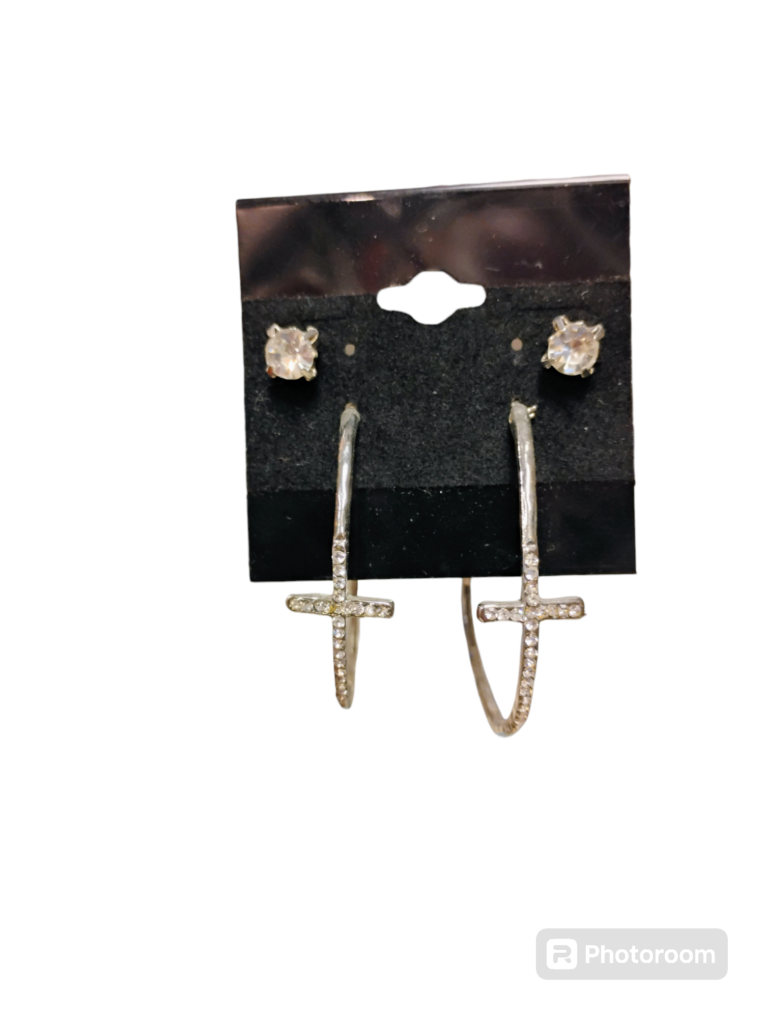 ✨ Make a statement in shimmer and spirit with Crystal Creed—a two-pair set that blends divine detail with everyday dazzle. The first pair features silver-toned hoops adorned with cross accents encrusted in rhinestones—bold, luminous, and full of edge. The second pair keeps it classic with faceted rhinestone studs that catch the light like whispered blessings.