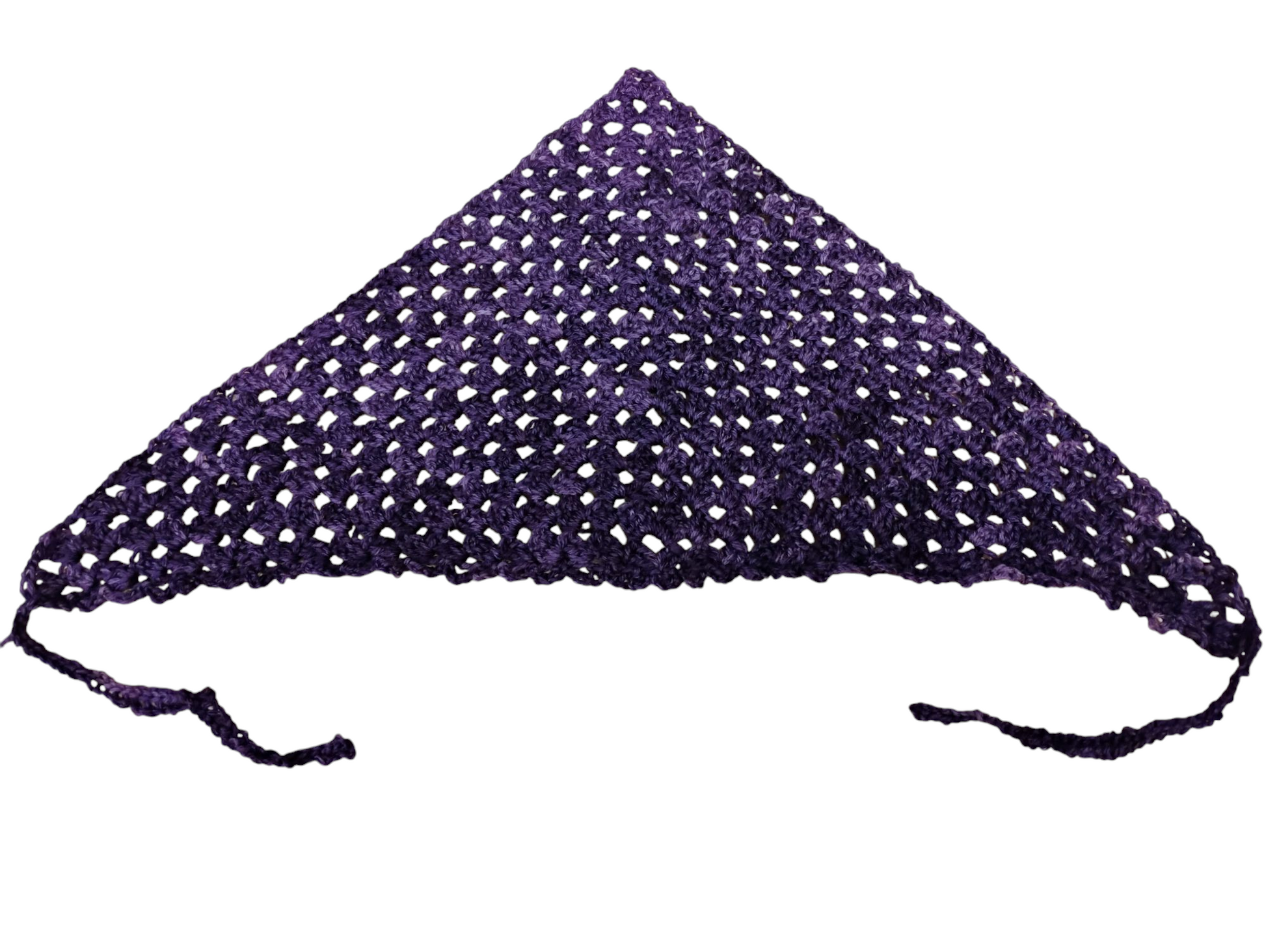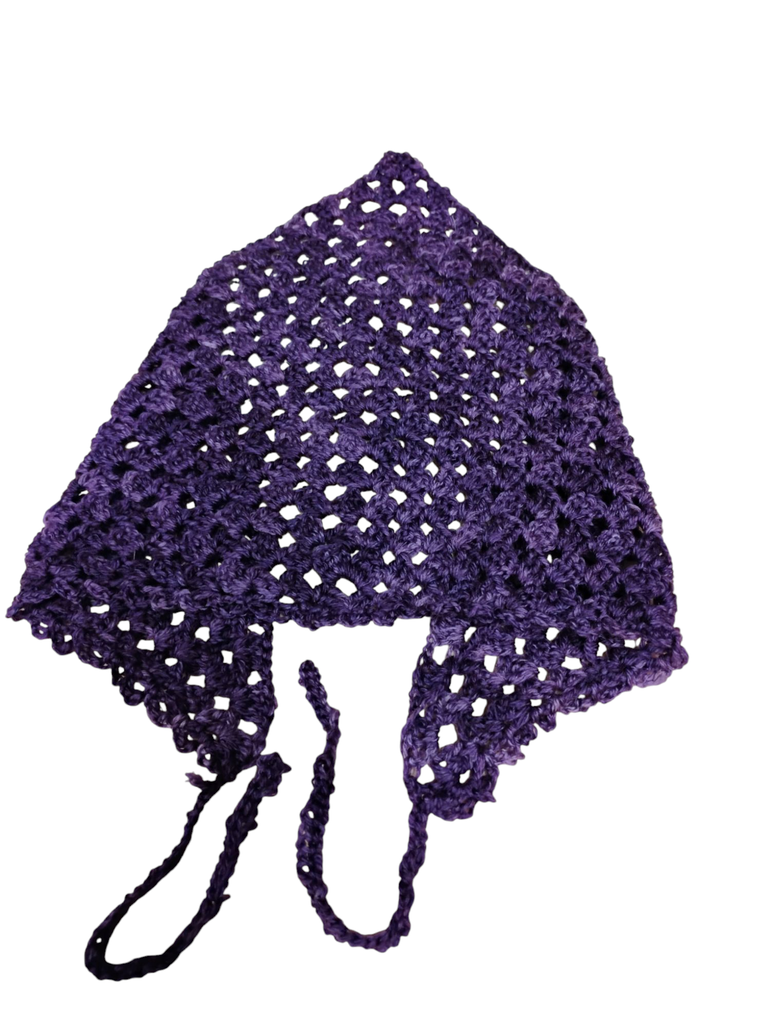 đ¸ Wisteria Whisper Crochet Kerchief Let your style speak softly but soulfully with the Wisteria Whisper Crochet Kerchiefâa hand-stitched headwrap in deep violet lacework that floats like a breeze and glows like twilight. With its airy texture and tie-on ease, this bandana is made for moonlit musings, messy buns, and everyday enchantment.