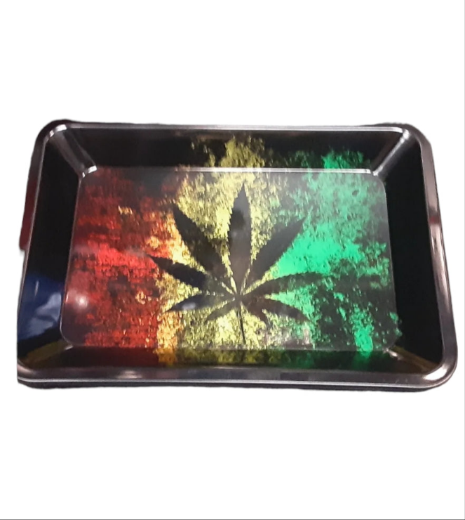 🍃 Leaf Signal Simple. Iconic. Elevated. A black leaf floats over warm Rasta tones, radiating peace, power, and plant love. It’s your go-to tray for clean vibes and smooth styling.