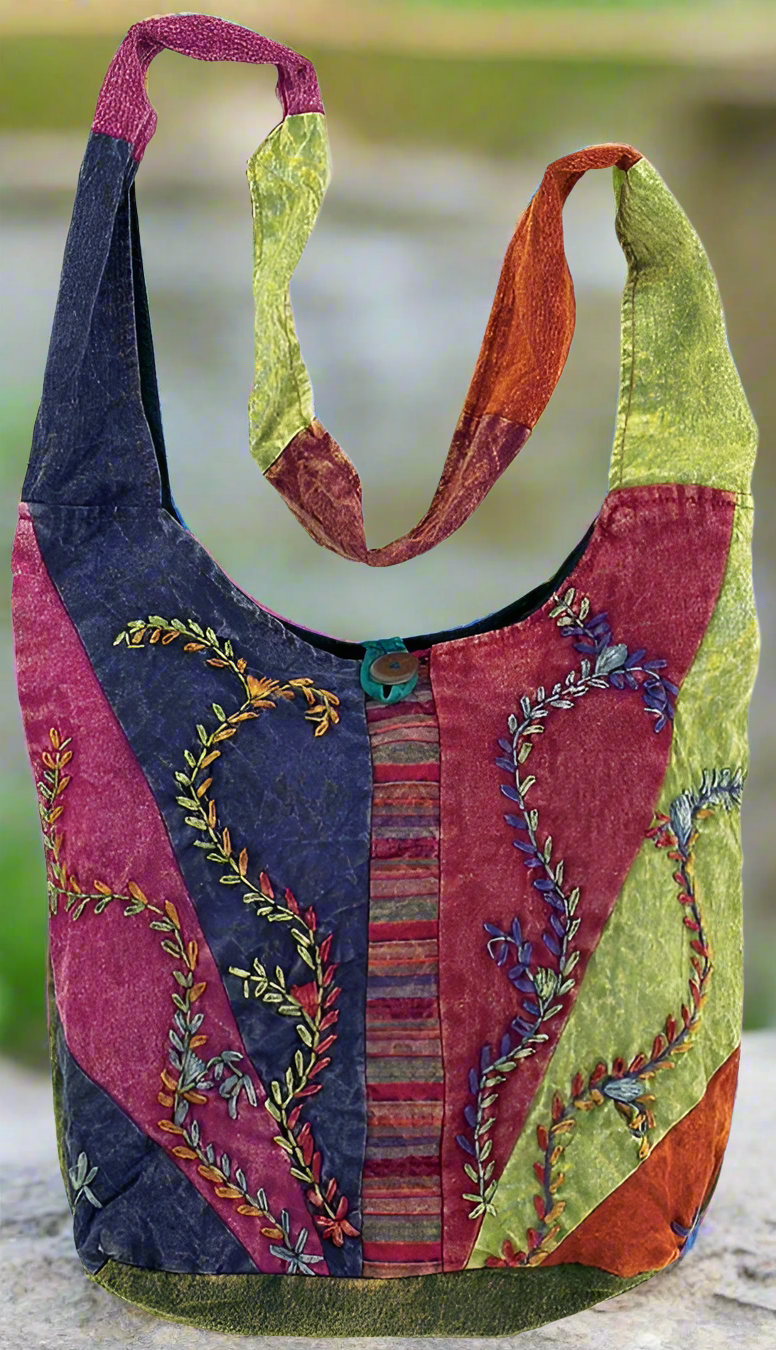 Let your spirit roam free with Gypsy Vine, a vibrant shoulder bag stitched for the wild-hearted and wander-bound. Crafted from stonewashed cotton in a kaleidoscope of earthy huesâsunset purples, forest greens, fire redsâthis 14" x 11" patchwork purse is a wearable mosaic of movement and meaning.