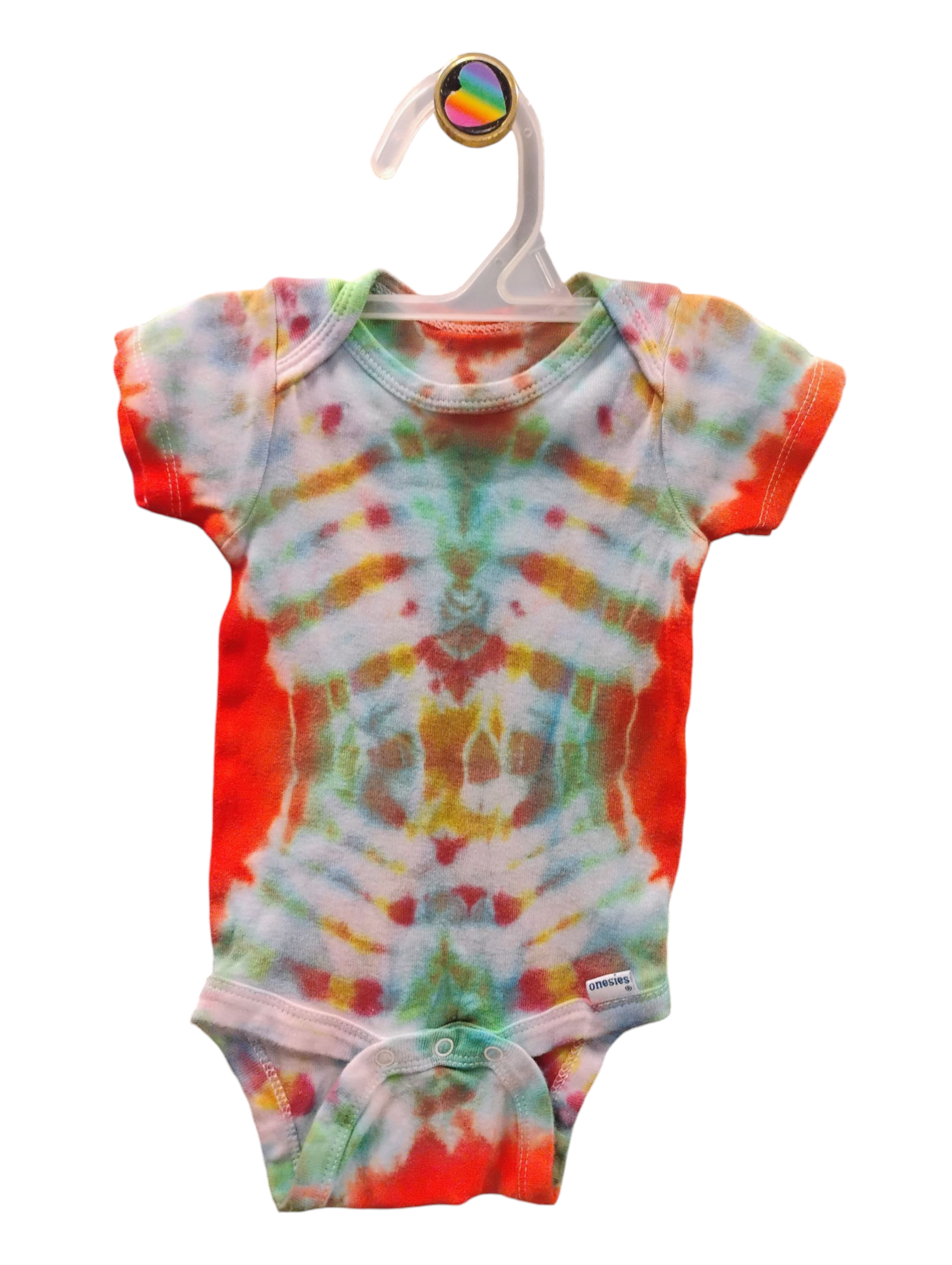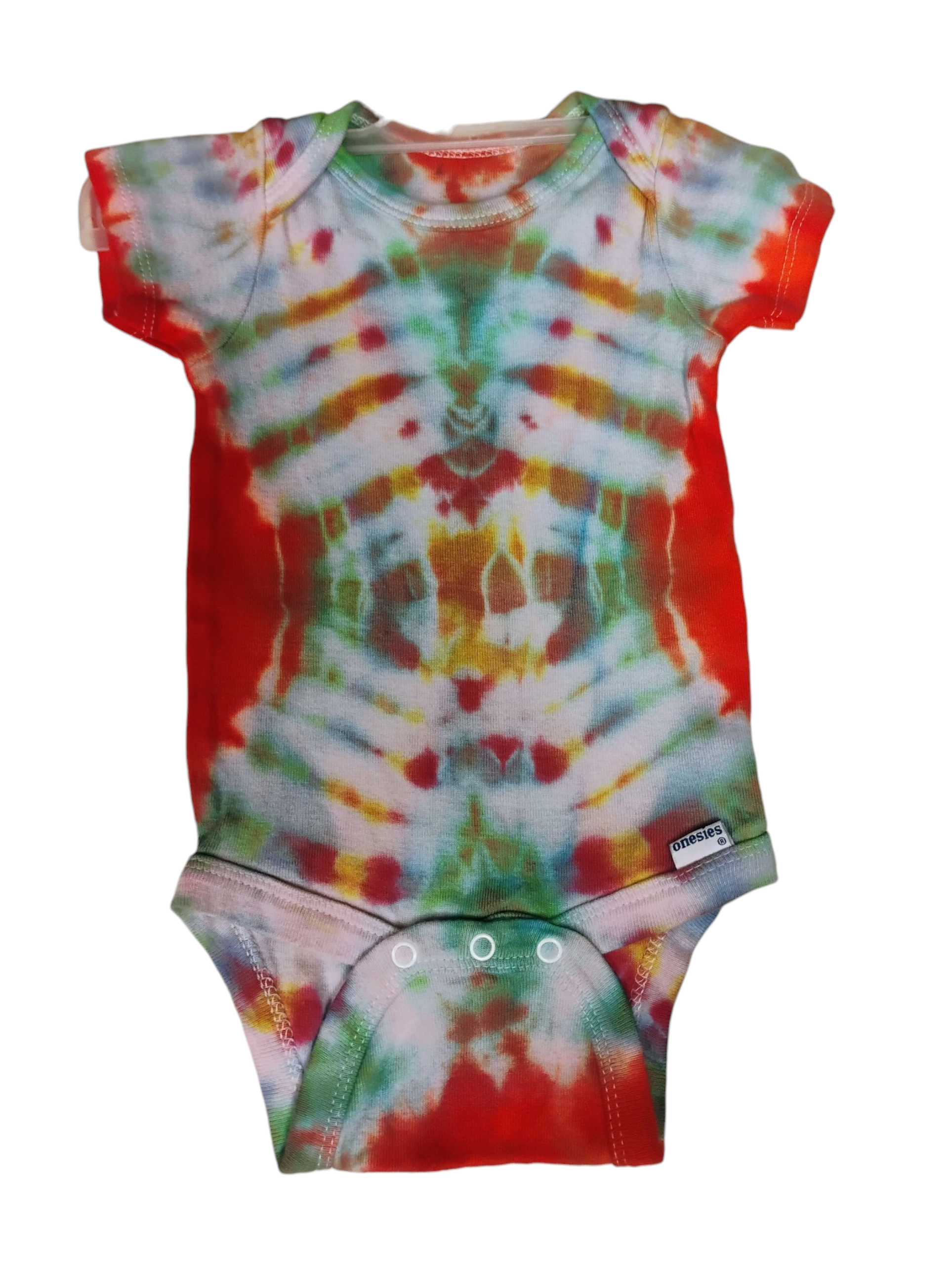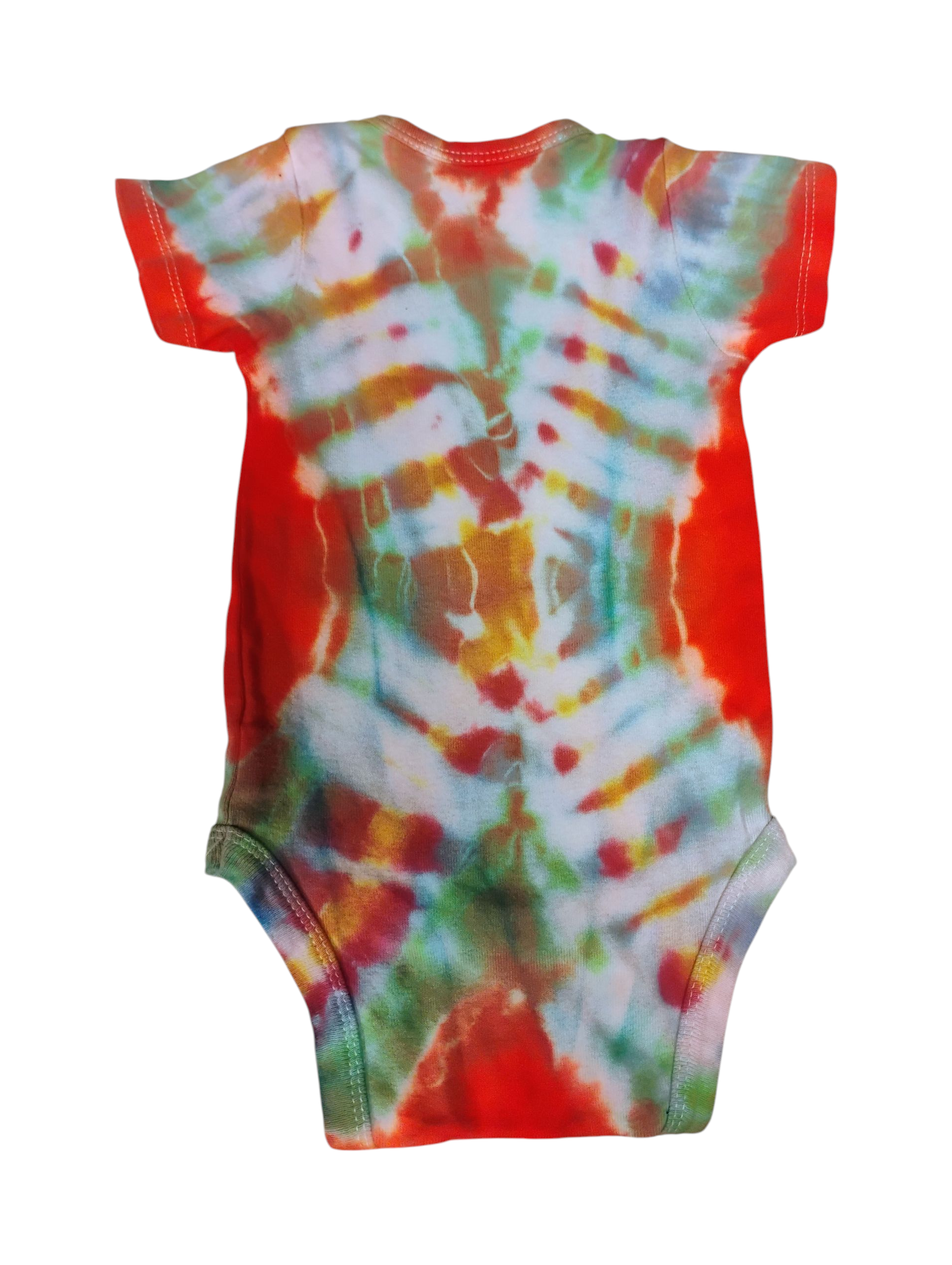 This isn’t just a onesie—it’s a wearable burst of baby bliss. Hand-dyed with love and a splash of cosmic whimsy, its radiant “X” pattern glows in hues of cherry red, leafy green, mellow yellow, and cloud-kissed white. Each piece is a one-of-a-kind swirl of nature’s palette, like a baby-sized sunrise wrapped in snuggles.