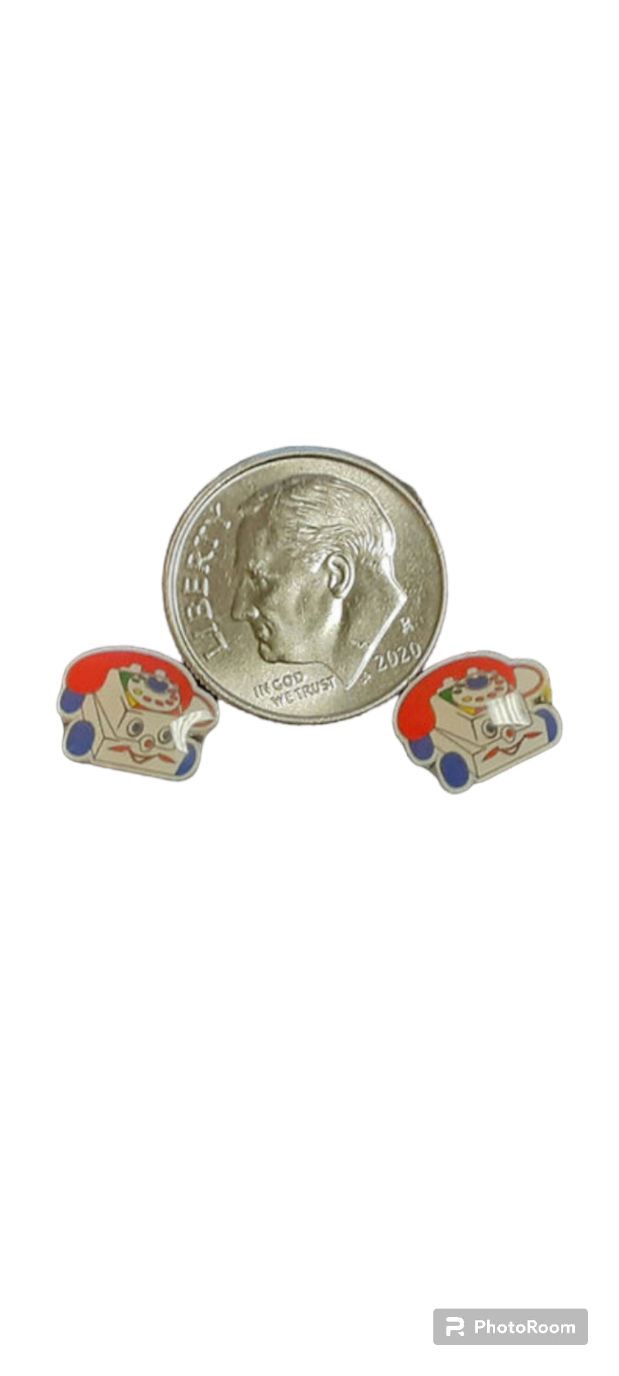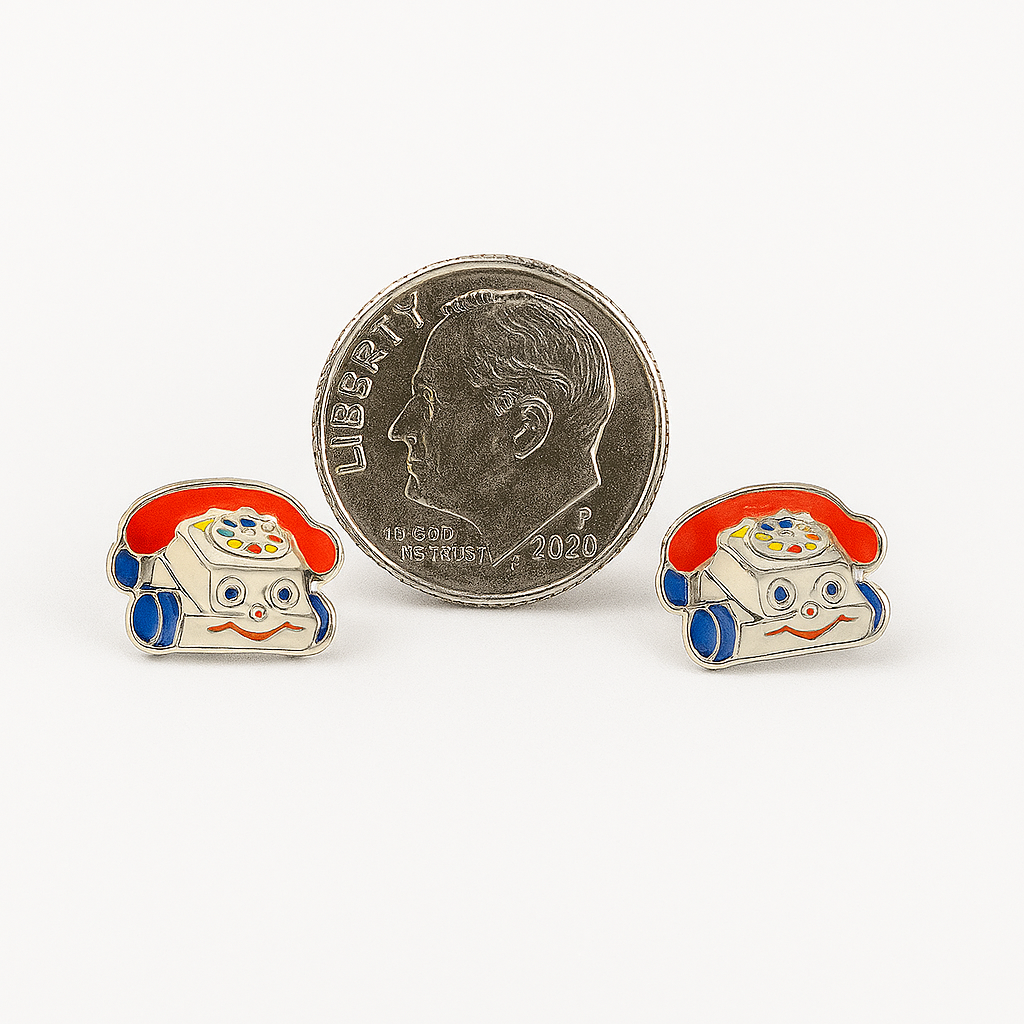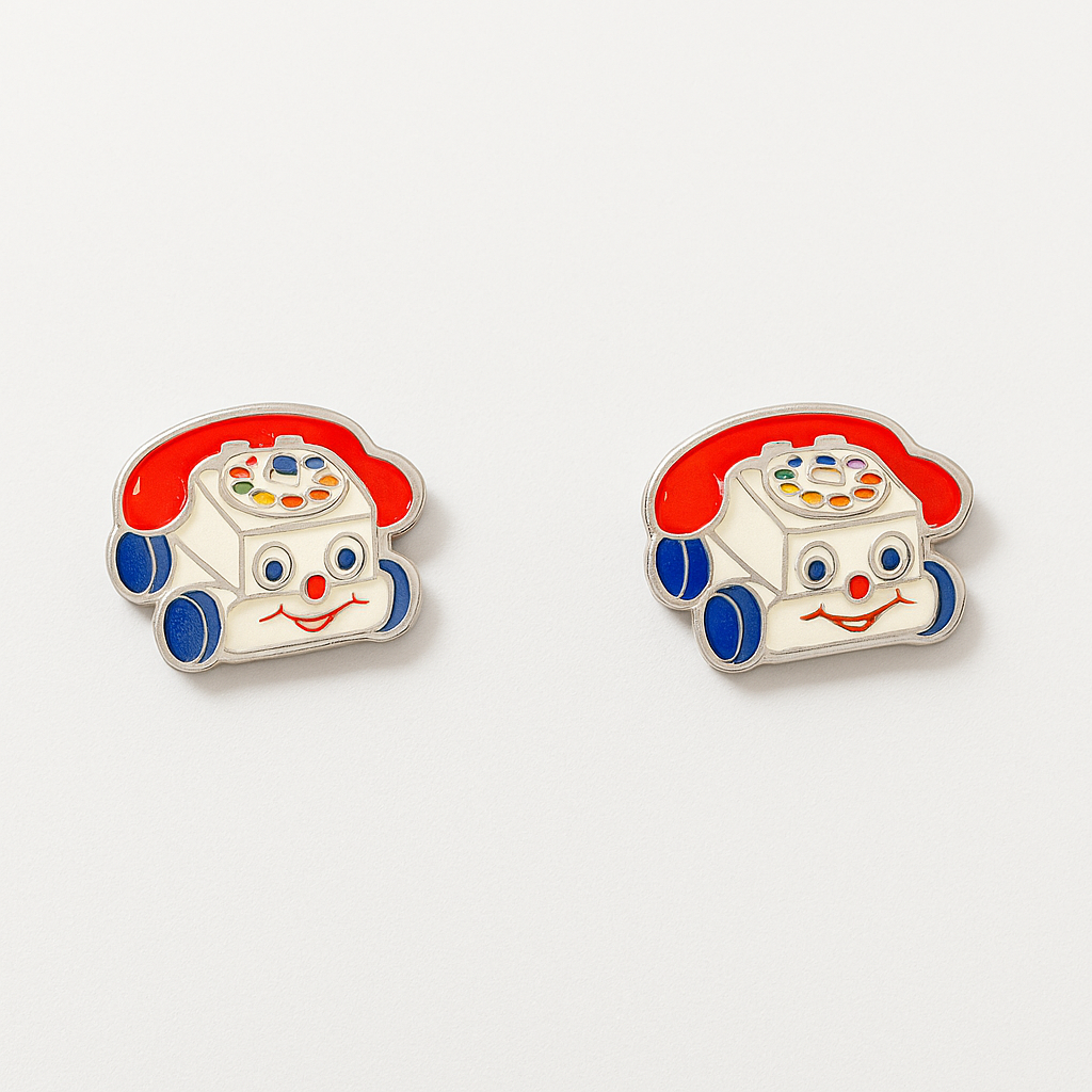 Meet 1-800-CUTE-AF, the ultimate throwback bling featuring the iconic Fisher Price chatter phone in all its googly-eyed, rainbow-wheeled glory. With red receivers, cheeky smiles, and stainless steel posts for sensitive ears, these babies are ready to dial up your outfit and your attitude.